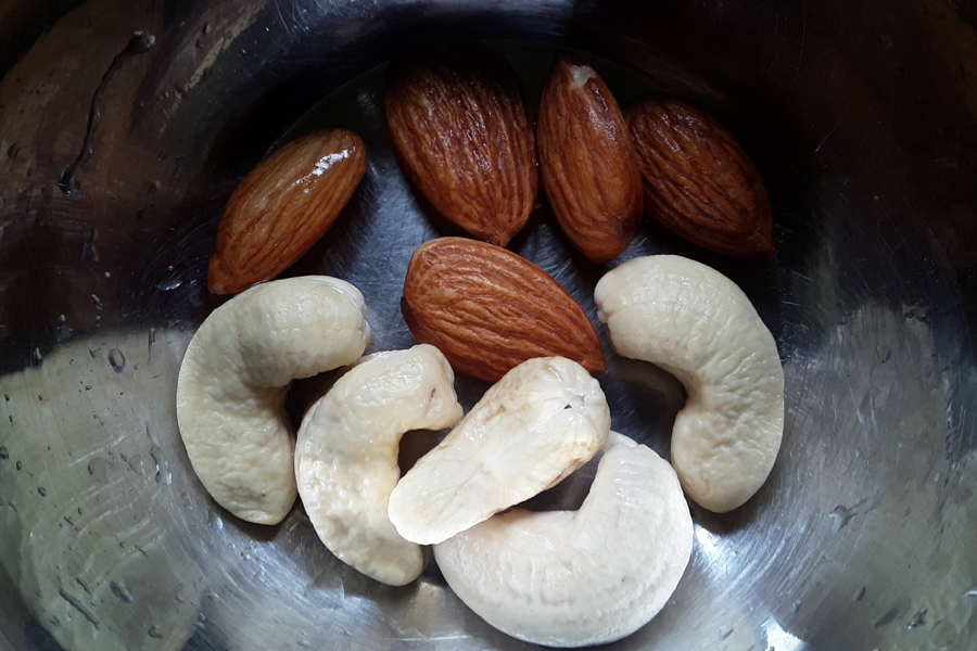 1. Rinse almonds and cashews. Dry fry / roast the nuts and keep aside.