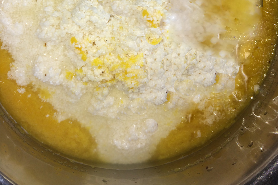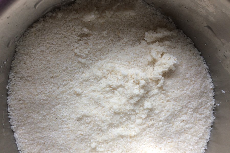 18. Take some portion of rice rava in your palm and squeeze it to take out all the water. Add this squeezed rice rava to the jackfruit juice. This way squeeze the entire rice rava and add to the jackfruit juice.