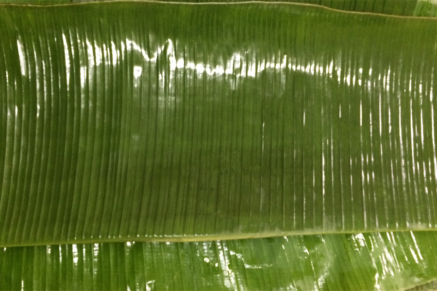 4. Take 5 long and wide pieces of banana leaf. Clean them very well with water or with wet cloth. Keep the thread (banana leaf fiber) when you cut the banana leaf.