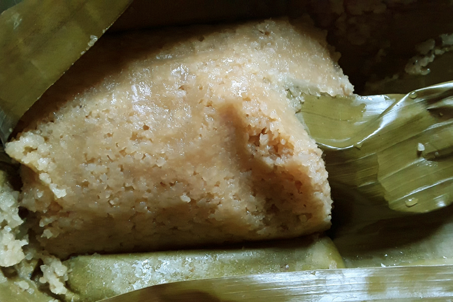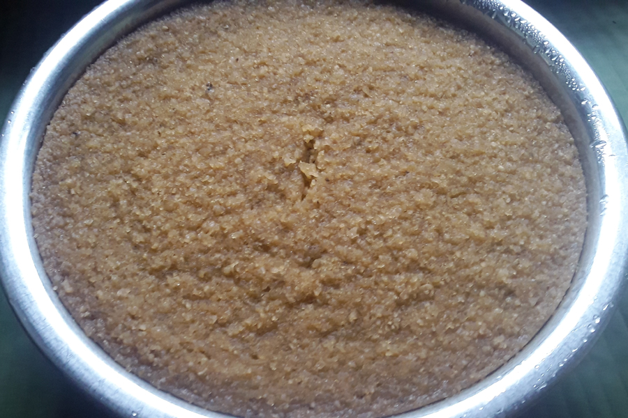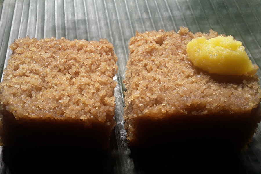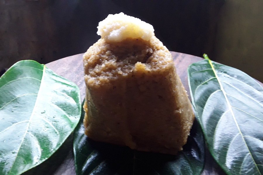 This luscious jackfruit kadbu is made with jackfruit juice, coarse rice rava (akki nucchu), jaggery, and flavored with cardamom. The kadbu has the aroma and taste of jackfruit combined with the flavors of cardamom and banana leaf. This soft, moist, sweet kadbu tastes more delicious when paired with fresh ghee.