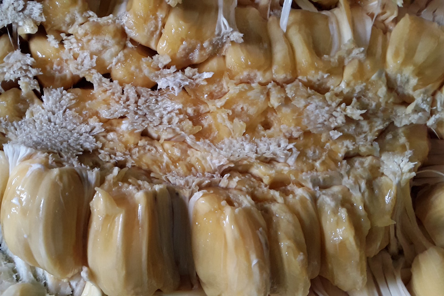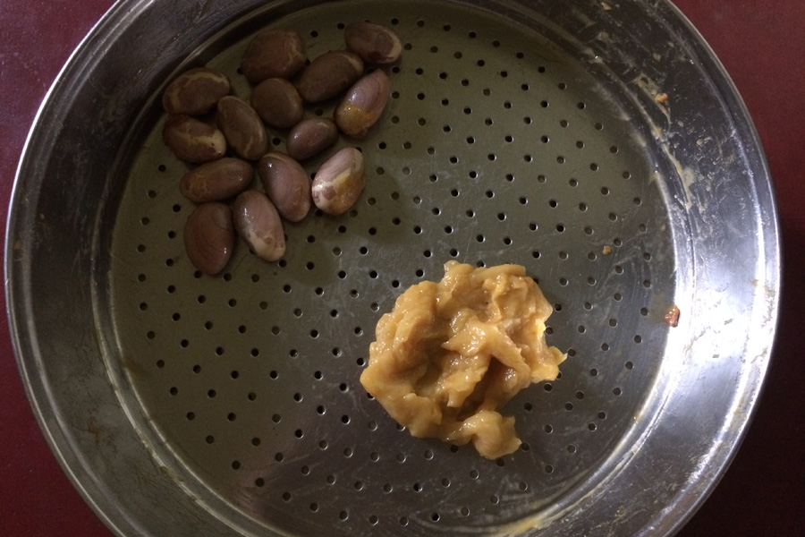 This wonderful fruit is seasonal and so are its delicious dishes. Varieties of dishes are made with both raw and ripe jackfruit. Being said that, for this kadbu ripe jackfruit is used. Like any other fruit, there are varieties in jackfruit too. For jackfruit kadbu, the soft jackfruit variety is used. This variety of jackfruit is soft like custard apple and does not require any knife or tool to cut. You can cut and open with your fingers. This variety is simply called as Halasu. And, the other one which is hard and requires knife to open is called Bakke.
