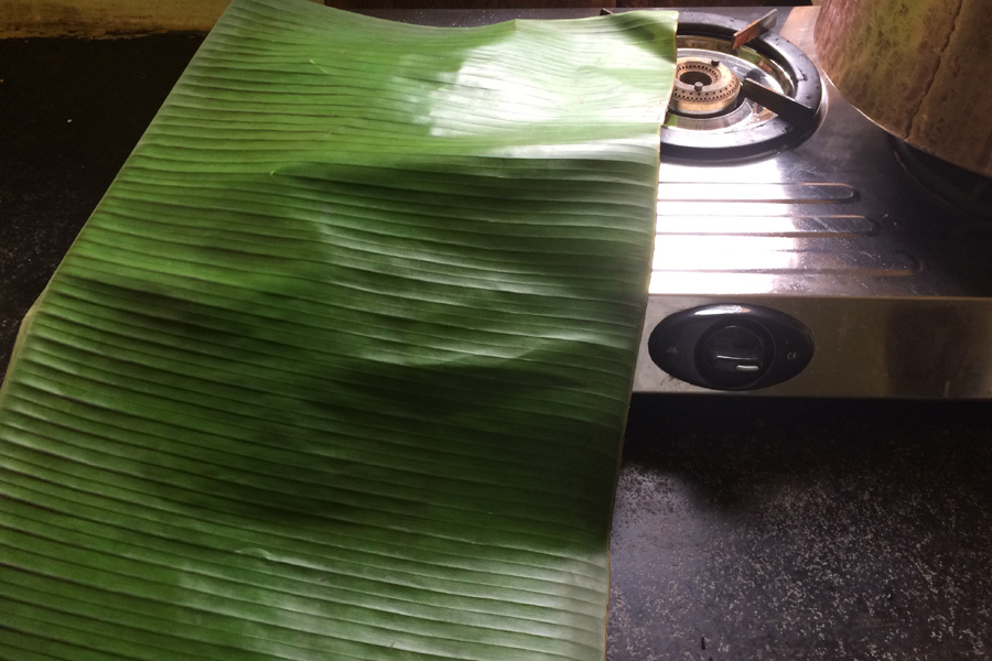 Observe that as soon as you pass banana leaf over a flame it starts changing the colour and will become shinier. Move the leaf constantly and quickly and do not burn.