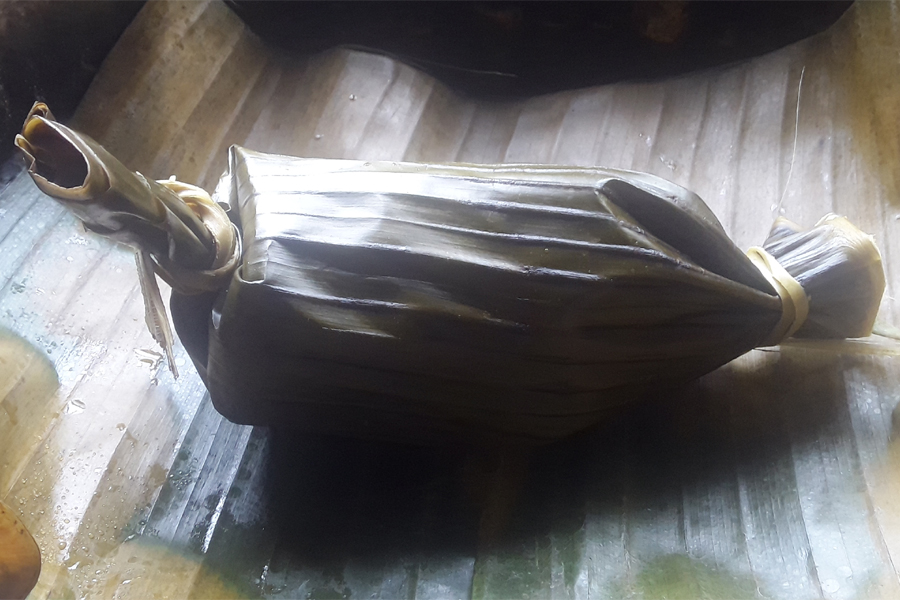 6. Then, take one banana leaf sheet and roll it to form a hollow cylinder.
