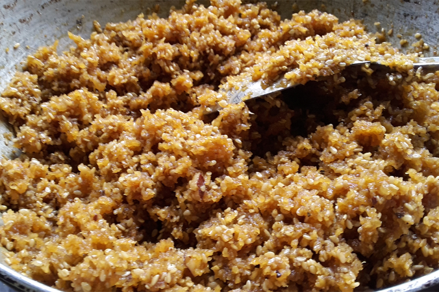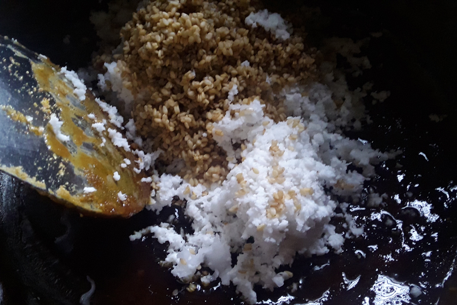 5. In a thick bottomed vessel or pan take jaggery, freshly grated coconut, sesame seeds, and cardamom powder. Mix them well.