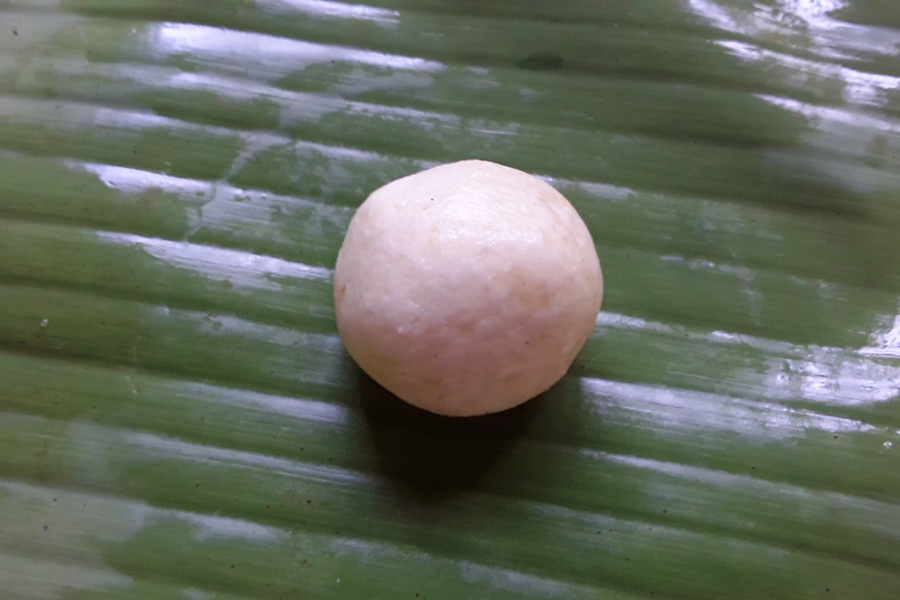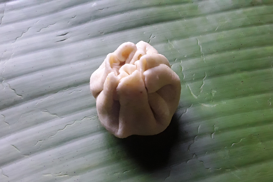Over time, while making the modaka, if the dough becomes dry, sprinkle some hot water and mix.