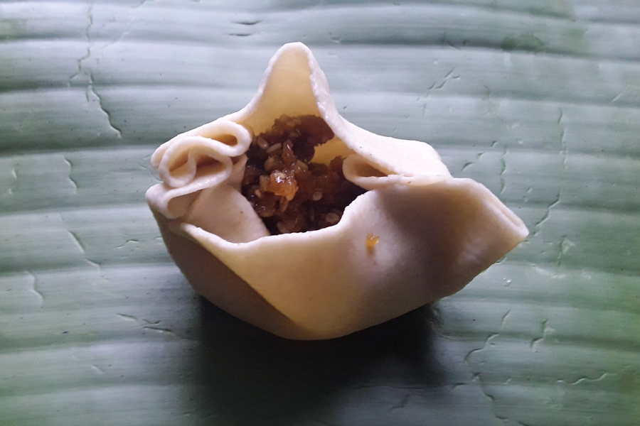 11. Join the edges firmly. Ensure that all the edges are joined well and there is no gap. Otherwise the filling will come out while frying. Shape all modaka and cover them so that the modaka does not dry out.
