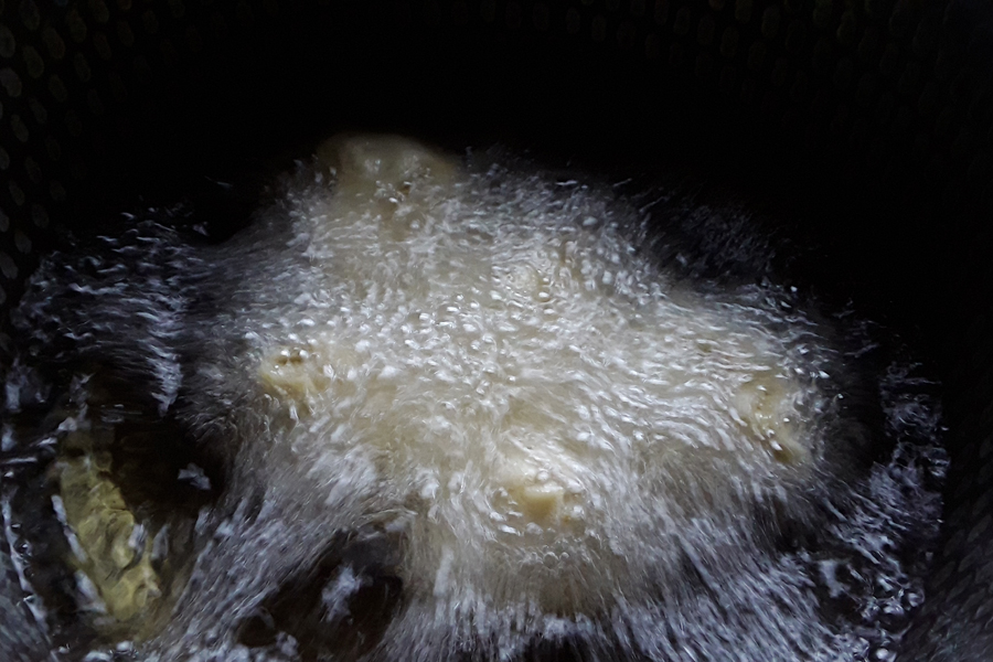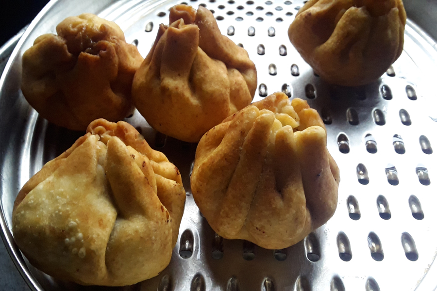 Fry modaka in medium hot oil. Frying in not hot oil makes modaka absorb more oil. Very hot oil will make the modaka undercooked.
