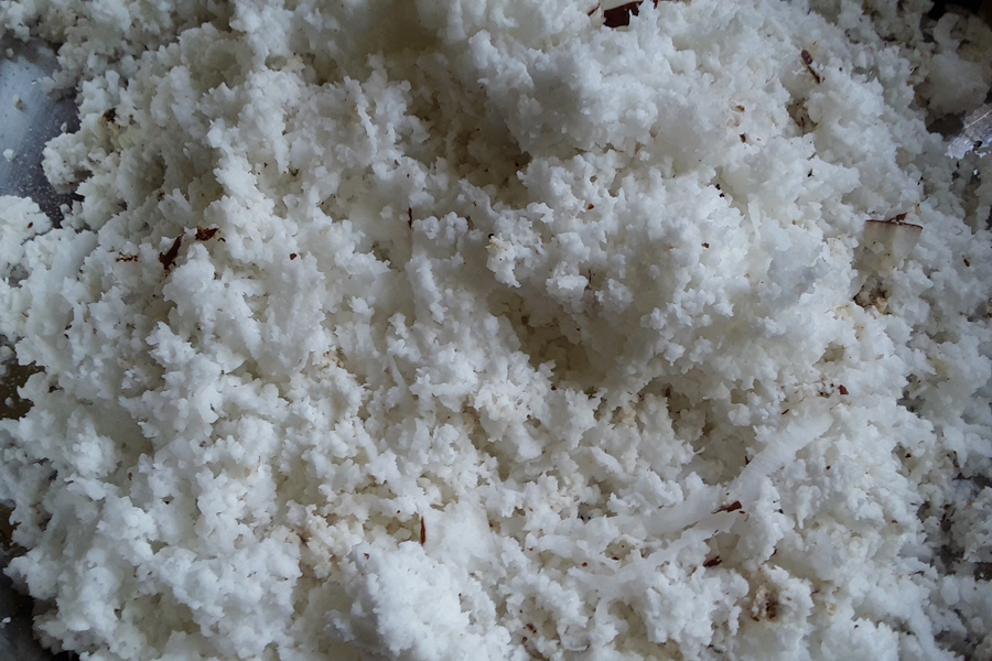 If you are using dry / desiccated / shredded coconut with powdered jaggery, add little water to mix them while cooking.