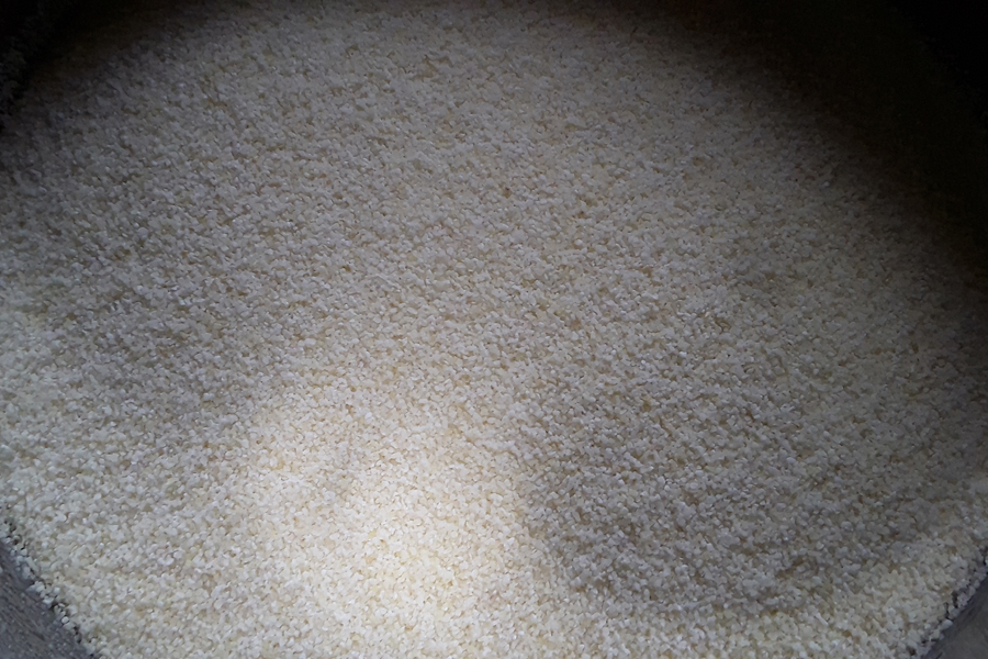 2. Take 2 cups rava in a mixing bowl. Add 1 teaspoon jaggery, and salt as required.