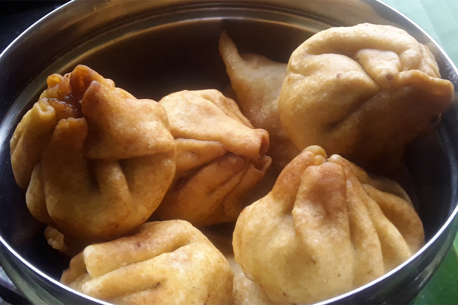 If the modaka opens up during frying, switch off the heat once the modaka that are already in the oil fried, carefully strain the oil and discard any filling that may have spilled, and then continue to fry again. Otherwise the filling will get burnt and will get stuck on every modaka that you fry later. To avoid this make sure to join / seal the modaka edges well without any opening.