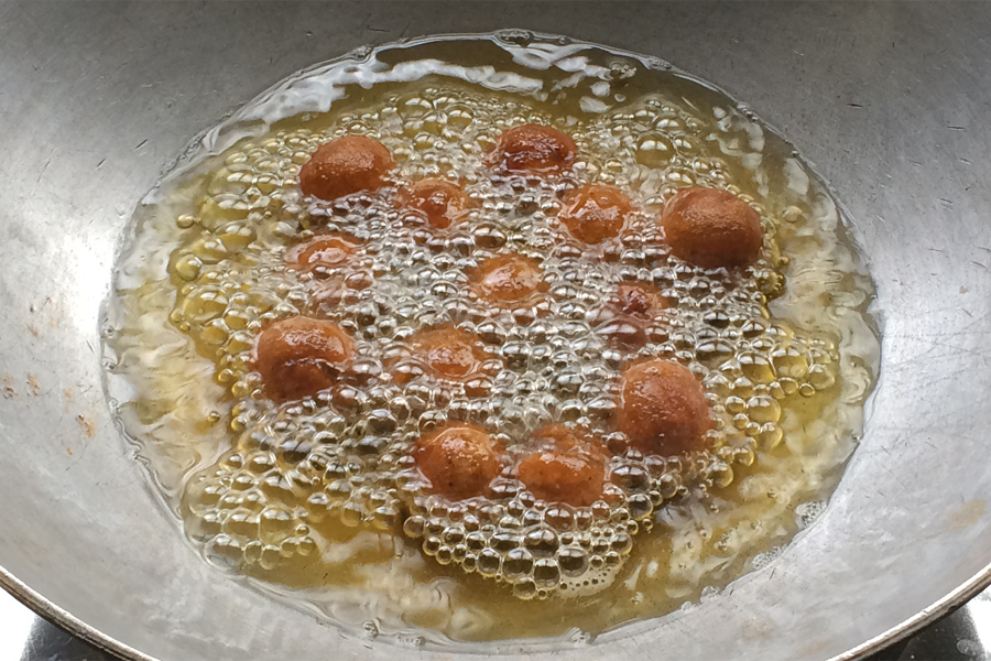 7. Take oil in a pan and heat on medium flame. Add dough balls to the hot oil and fry while flipping them frequently.