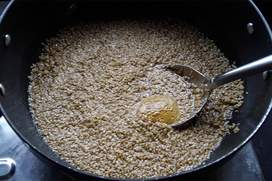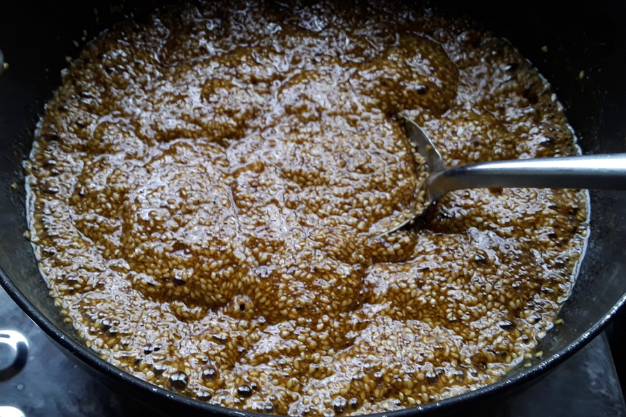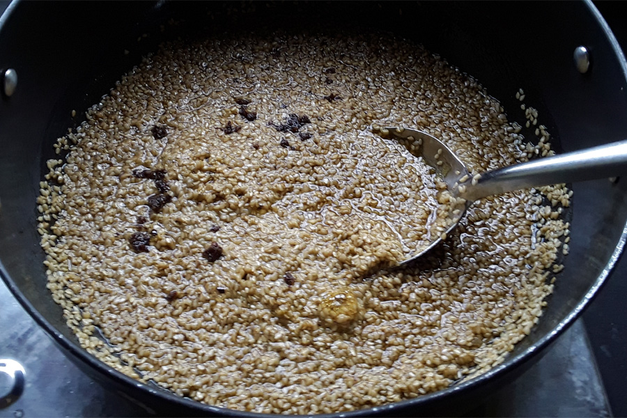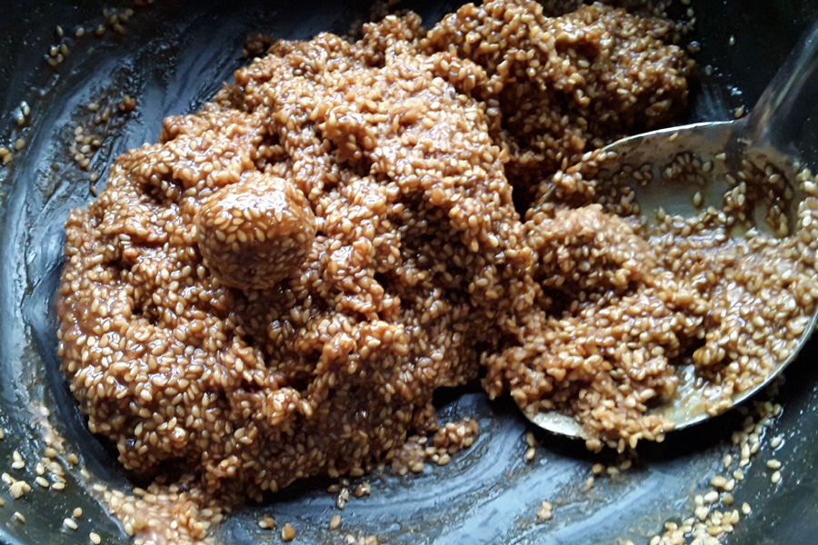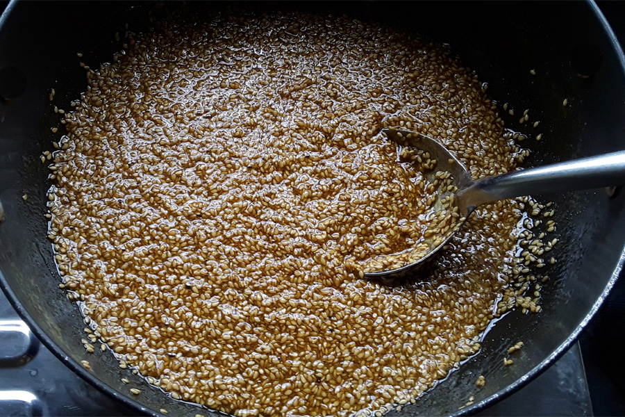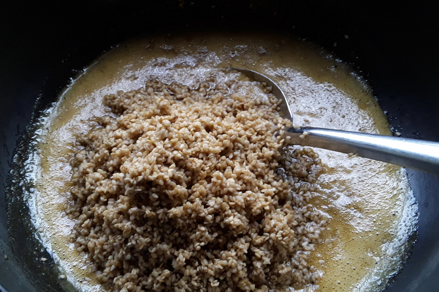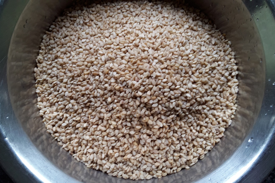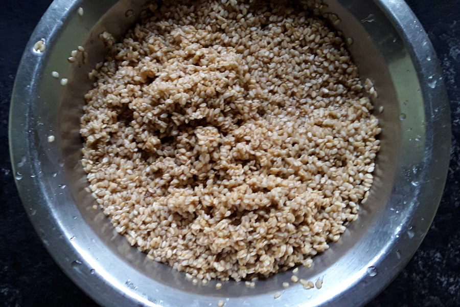 Rinse the sesame seeds just before heating jaggery. Do not rinse and keep for a long time.