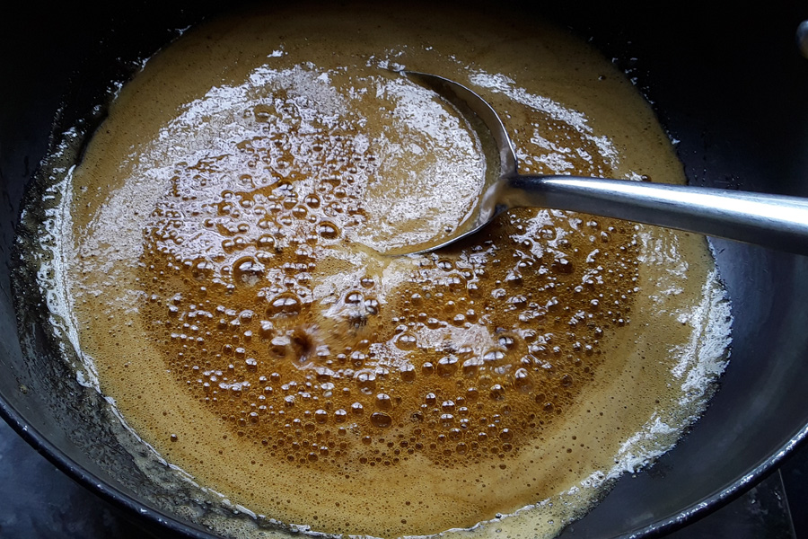 6. Keep on stirring the jaggery. Jaggery will melt more and starts bubbling.