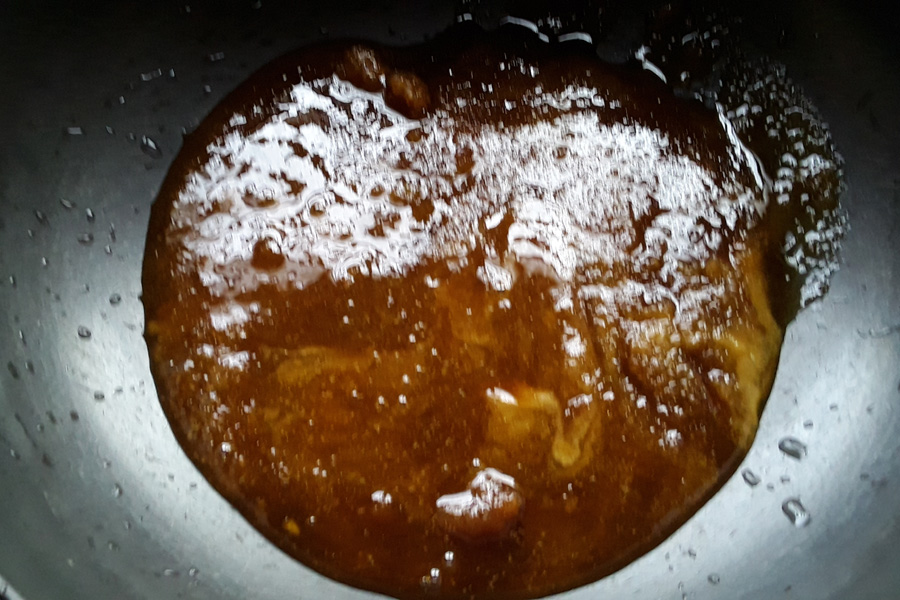 5. Keep the pan or vessel with jaggery on stovetop on low heat. This is semi liquid jaggery and no need to add water.
