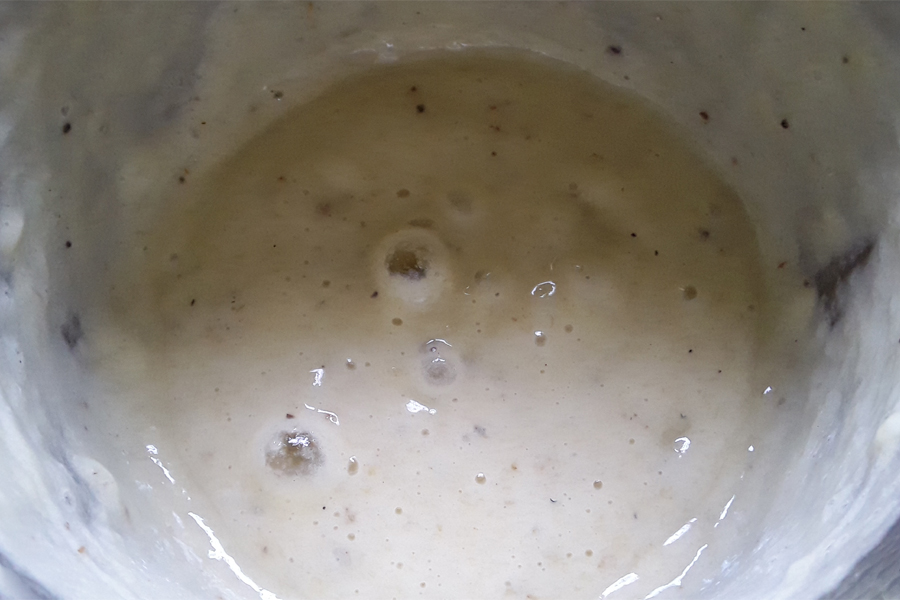8. Once jaggery is well combined with banana puree, add ghee and mix well.