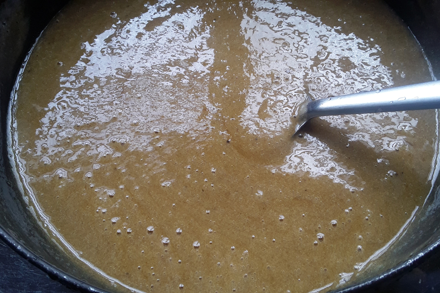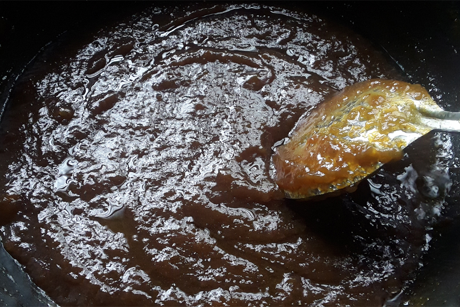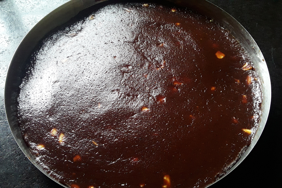 9. Cook further stirring continuously. Mixture starts thickening, also turns dark.