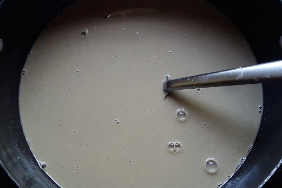 6. Now take remaining sugarcane juice in a thick pan or heavy vessel / kadai. Add rice batter and mix well. There should be no lumps.