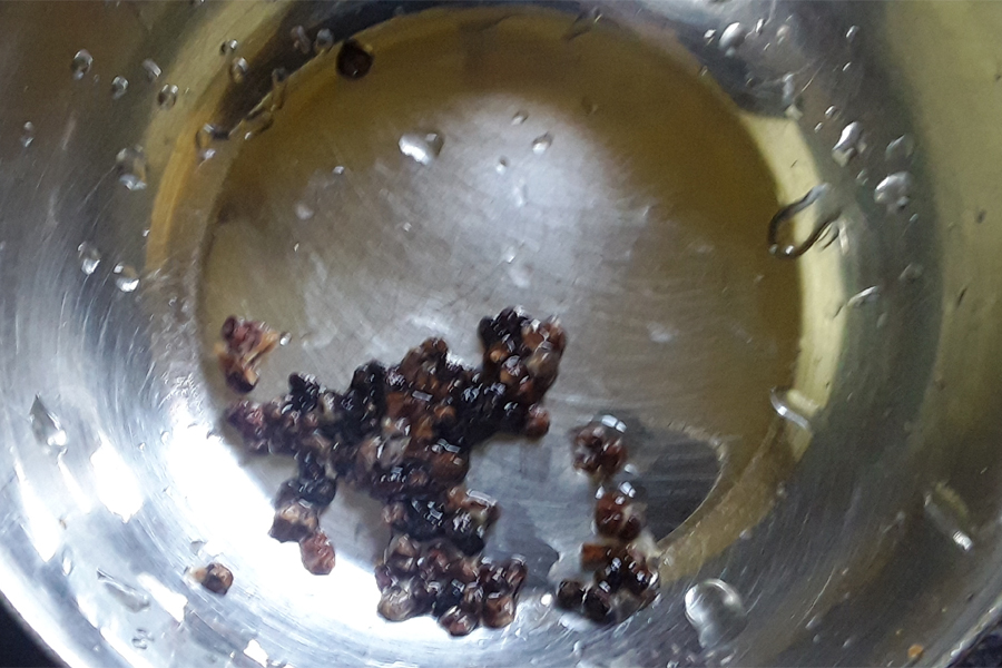 3. Take 2 cardamoms, take out the seeds, and rinse them. Cover and keep aside. Grease a steel plate or tray with ghee and keep it handy too. (Greasing is optional.)