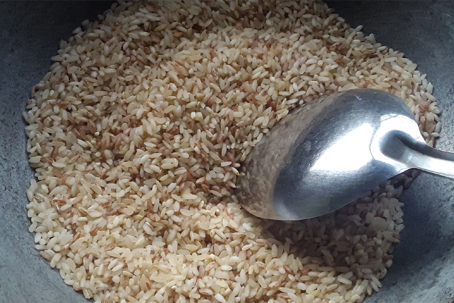 1. Take rice in a thick pan and dry roast on low to medium flame for about 5 minutes. Let it cool.