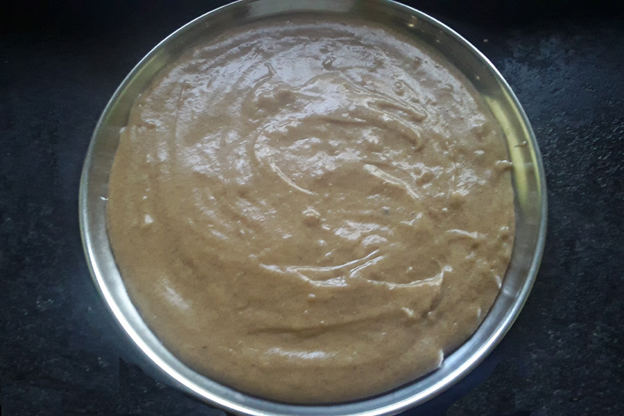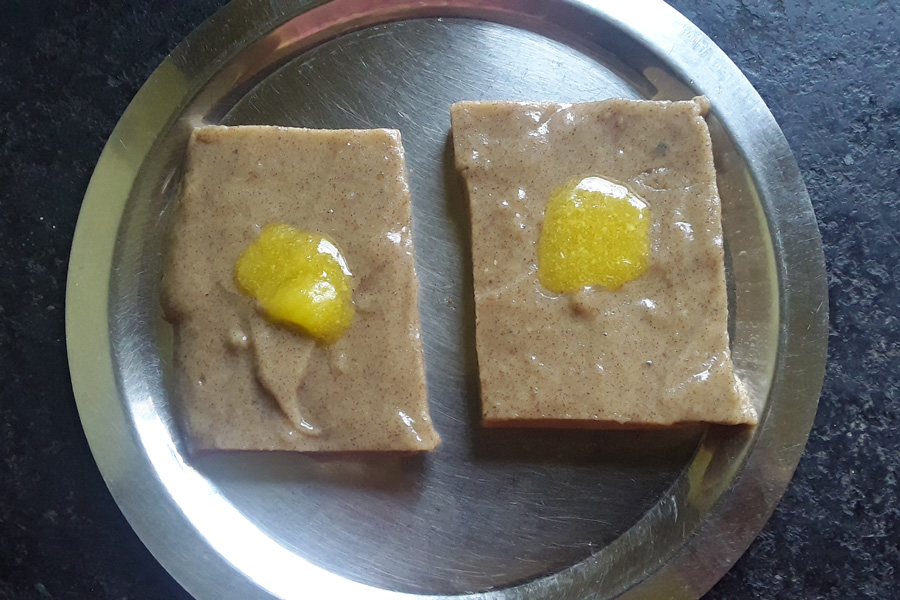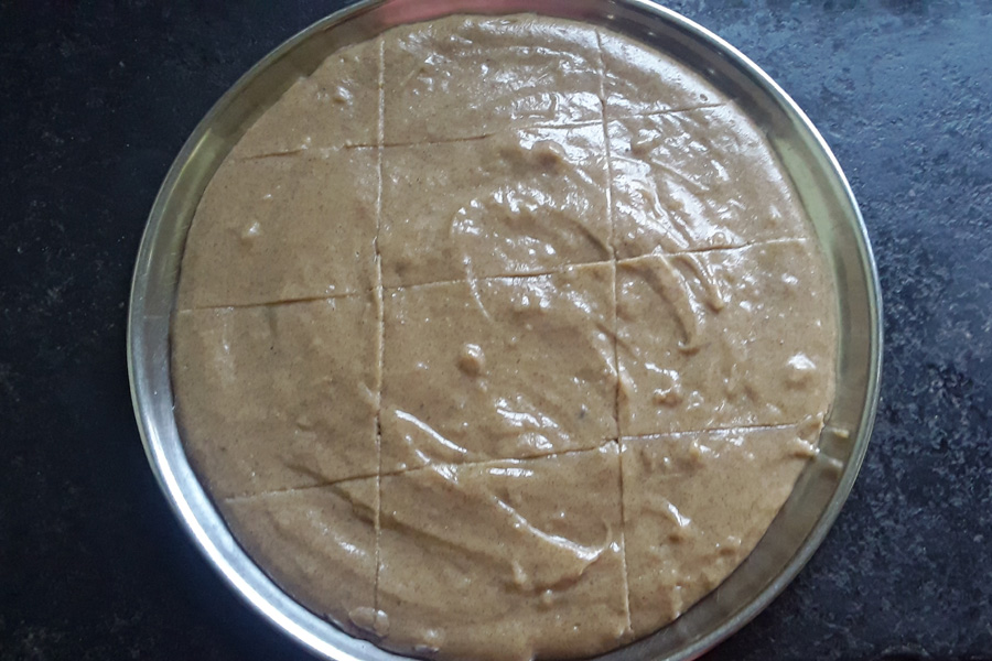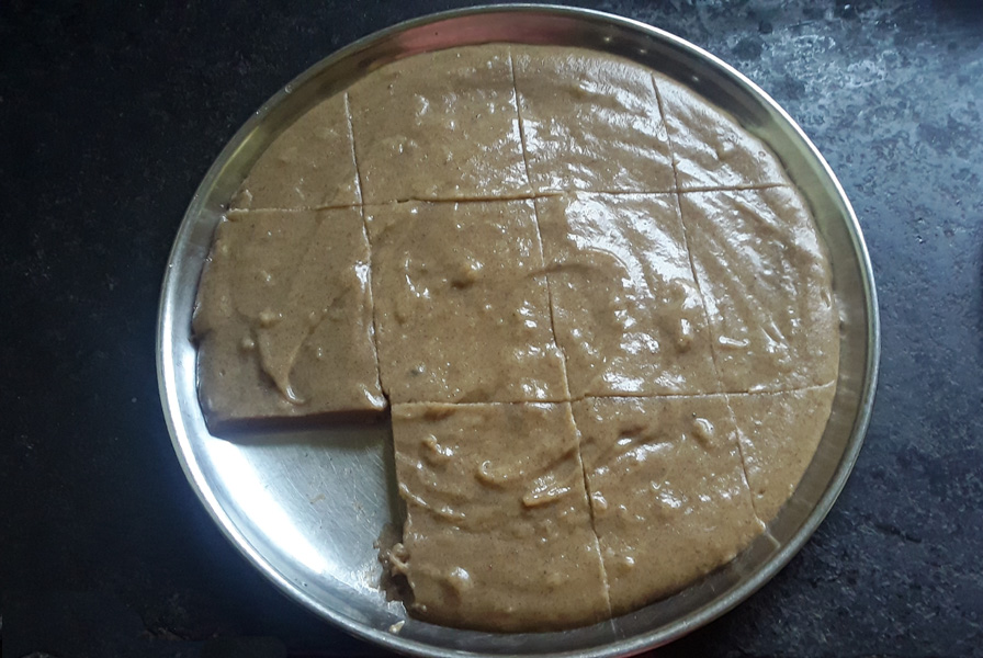 13. Now pour the Manni dough or mixture to a greased plate or tray. Spread it evenly with a spoon or spatula keeping height of 1/4 to 1/2 inch as per your preference.