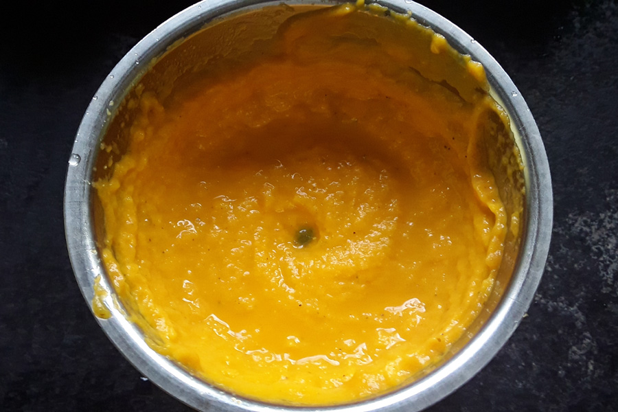 12. Take the carrot puree in a pan or vessel. Add leftover carrots boiled water and mix well.