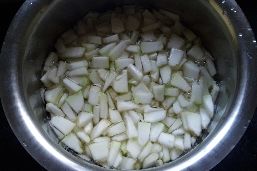 2. Take chopped bottle gourd in a pan or vessel. Add required water and boil on a medium heat. Let it cook to a soft texture.