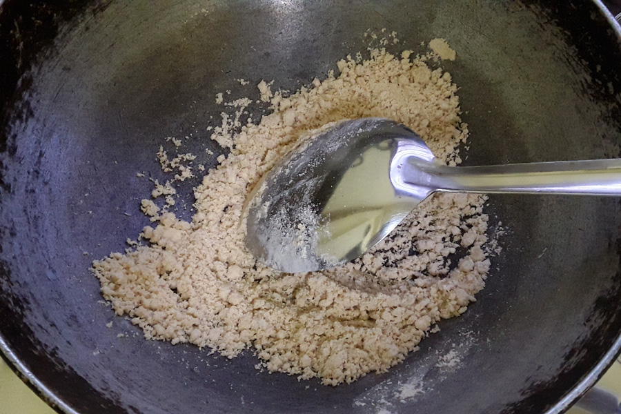 6. Stir non-stop and sauté until it turns golden or brown and aromatic. Switch off the heat and let it become warm or cool.