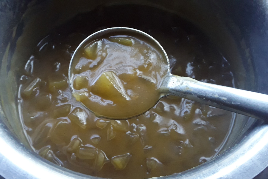 9. Now, once the bottle gourd is cooked to a soft texture, add 2 tablespoons jaggery or as required. Add 1/4 teaspoon salt or as required.