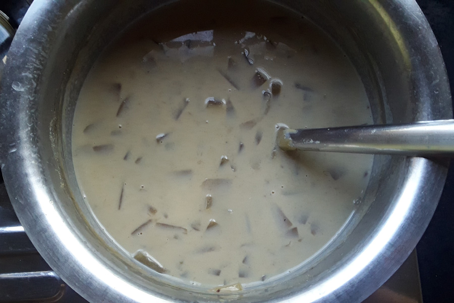 13. Once the paayasa mixture thickens, reduce the heat to low.
